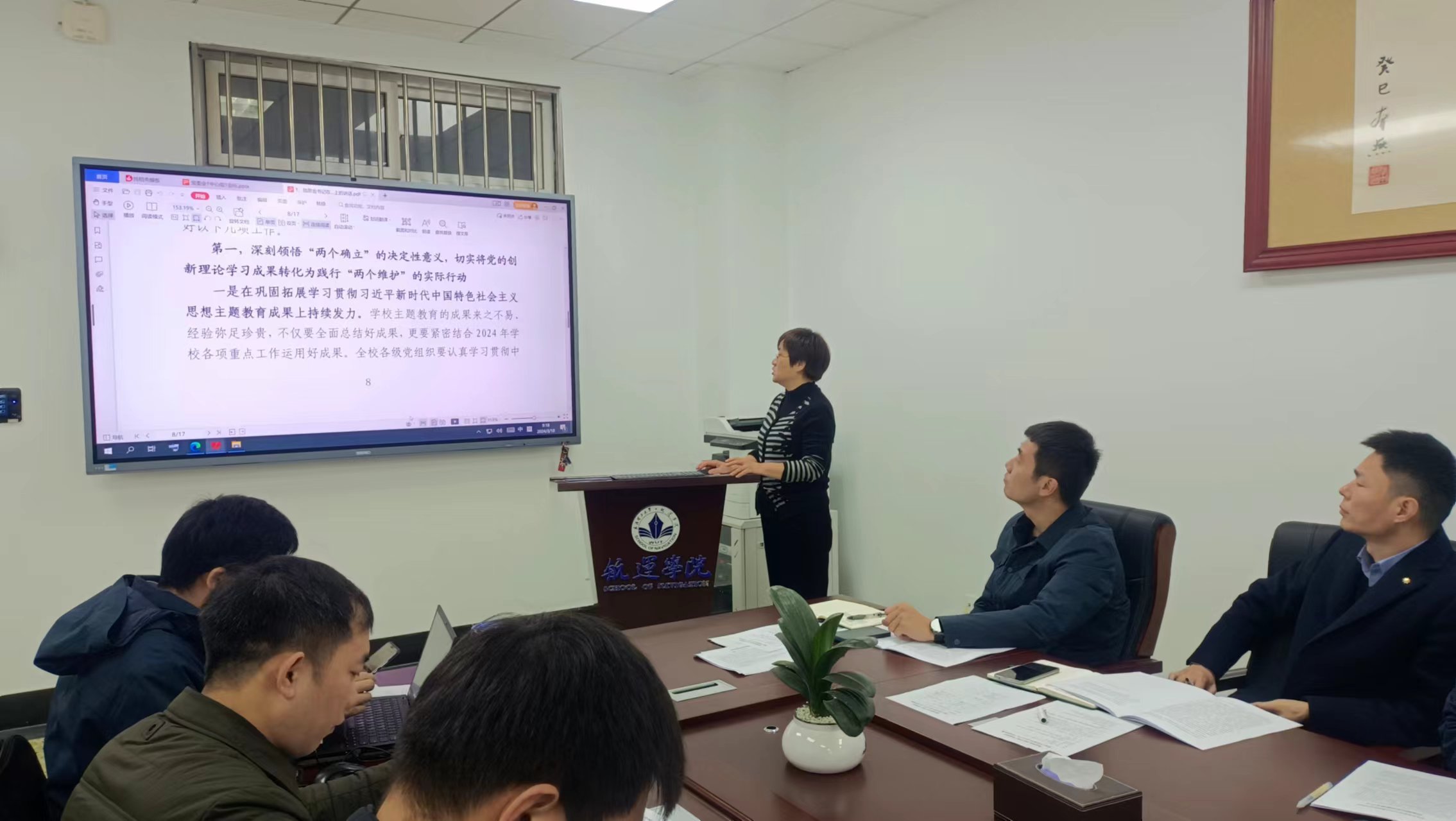 赵娟娟书记领学了习近平总书记在二十届中央纪委三次全会上《深入推进党的自我革命,坚决打赢反腐败斗争攻坚战持久战》的重要讲话精神,结合传达学校2024年全面从严治党大会、党建工作会精神,与大家共同学习领悟习近平总书记关于党的自我革命的重要思想,强化对党的自我革命重要意义的认识,增强纵深推进全面从严治党的政治自觉、思想自觉和行动自觉。会上,传达了信思金书记、夏江敬副书记在学校2024年全面从严治党大会上的讲话精神,结合学校发生的违规违纪违法典型案例开展警示教育,希望大家提高纪律和规矩意识,压紧压实岗位管理责任,推进学院全面从严治党和各项业务工作落地见效。