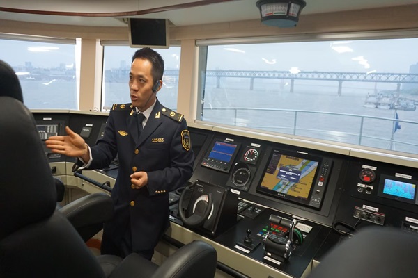 随后,师生登上停泊在江畔的海事趸船“江城守护者”号,工作人员现场演示了船舶动态监控系统,通过AIS实时追踪航道船舶动态,并讲解VTS在复杂航段的调度逻辑。在长江海事旗舰指挥船“海事01”号的参观中,其搭载的多频段通讯设备和三维立体搜救系统,更让同学们惊叹于我国内河航运应急能力的国际领先水平。