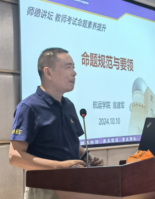 翁建军教授以《命题规范与要领》为题,围绕命题规范、试卷结构、试卷编制要领等内容,重点阐述了课程试卷命题过程中的关键问题及各类型题目的编制要领。培训中,翁建军教授还结合个人命题经验,分享了航海类课程的命题原则和要求,详细地介绍航海类课程在命题时如何兼顾符合性、时效性、针对性、实用性、规范性、逻辑性等。他提出,好题都是“磨”出来的,每位教师应精心选题、循规编题、矻矻磨题、细致审题,各课程组要集思广益,把试卷出好出精,既是个人责任,更是团队任务。
