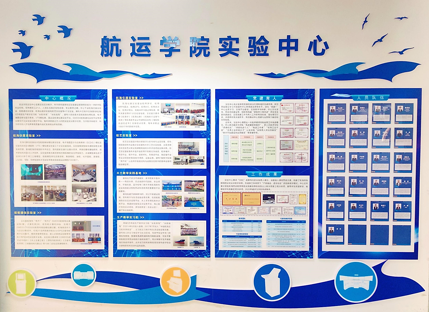 该文化墙以“航海蓝”为主色调,巧妙融入海浪波纹、国际船旗、翱翔海鸥等航海元素,并结合船舶驾驶台、模拟训练设备等教学场景剪影,构建独具特色的文化空间。内容涵盖中心概况、党建育人、工作成果、队伍风采四大板块,通过图文并茂的形式,系统呈现实验中心近年来在平台建设、人才培养、科研创新等方面的情况。“文化墙不仅是中心发展的缩影,更承载着航海人开拓进取的精神。”实验中心负责人表示,文化墙的建成有效增强了团队凝聚力,也为校内外参观交流搭建了展示窗口。
