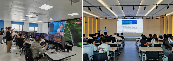 在港口码头上作业平台上,同学们近距离体验了无人集卡运营、轨道吊装自动化作业、岸桥智能理货、铁路自动化装卸等场景,感受了数智化技术+铁水联运的安全、高效和智能。在调度指挥中心,参观了由数字孪生技术构建的高保真、动态更新的港口虚拟管理平台,观摩了港口调度人员通过数字孪生体全方位、实时监控港口的日常运行情况,同学们对3D数字孪生引擎和实时大数据分析在大规模港口管理上的优势感到十分震撼。