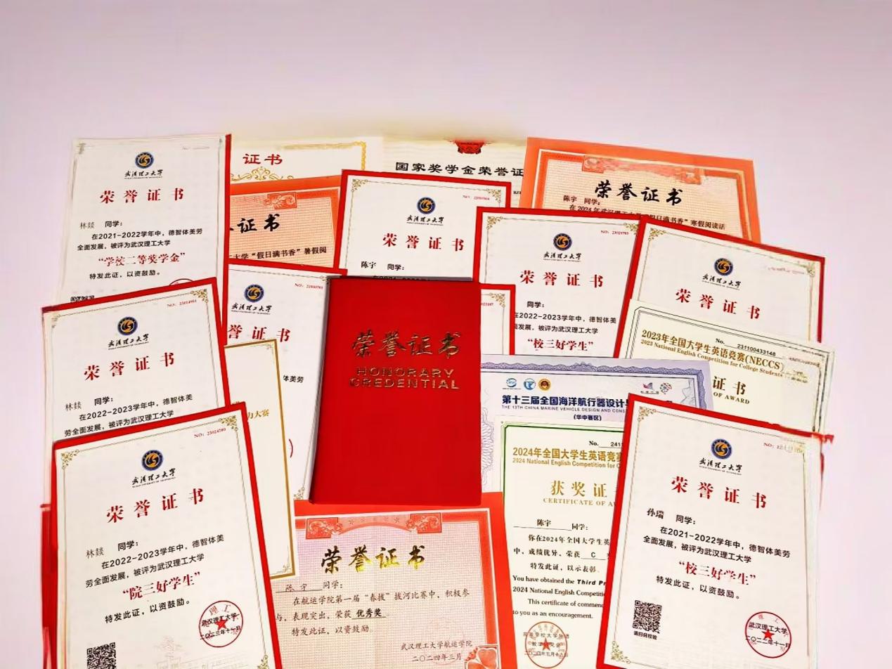 奖学金及荣誉称号:学业奖学金、招商轮船奖学金;校优秀共青团干部、院三好学生、院优秀学生干部等。