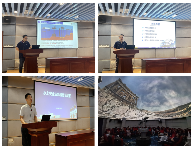活动第一项为水上安全应急主题科普讲座,本次讲座由安全应急管理学院雷鹏老师与新葡的京集团350vip翁建军老师主讲,新葡的京集团350vip党委副书记王树鹏主持。安全应急管理学院雷鹏老师讲座主题为“大安全观下的水上安全”,雷老师围绕大安全观概述、个体安全、运营安全、水域安全四个方面展开,讲述了大安全观的相关概念,介绍了典型水上安全事故、个人自救措施、船舶安全、海洋工程结构物安全、水域污染治理等方面的知识。新葡的京集团350vip翁建军老师讲座主题为“水上交通风险控制与应急处置”,翁老师围绕水上交通的基本特征、风险源及预测预控,讲述了交通风险的概念与特点,同时结合水上交通风险典型案例,介绍了水上交通风险应急事件的处置方式方法和提升水上风险预控和应急能力的途径。讲座最后,王树鹏书记针对本次活动进行总结,希望参会同学们可以通过本次活动,安全常识牢牢记在心中,树立良好的安全观,责任观,将自身所学与国家战略、社会需求相结合。