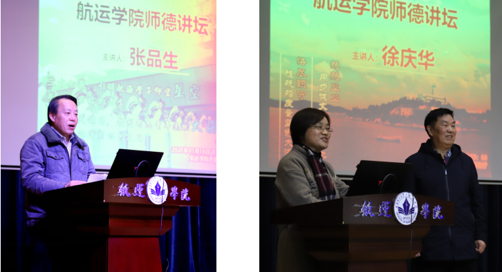 学院师德讲坛于去年12月首次开讲以来,学院教师反响强烈。本期师德讲坛特别邀请学院一线教师、航海技术系张品生副教授和管理服务一线职工、木兰水上训练基地徐庆华主任做开讲嘉宾。三十多年来,两位老师在教育岗位上尽职尽责,今年年初即将光荣退休。学院经研究后,特意通过师德讲坛的形式表达对两位职工的敬意和祝福,也希望以此方式将他们爱岗敬业的精神和踏实奉献的品格在学院得到传承、弘扬。